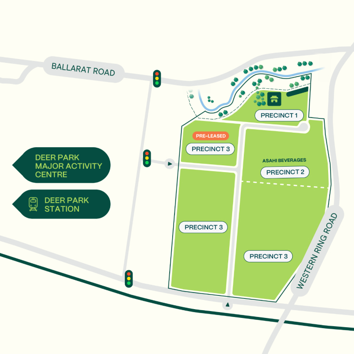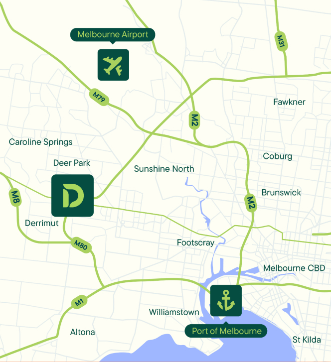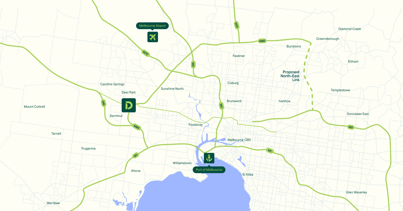 Situated on the Western Ring Road and Ballarat Road junction, Deer Park Estate is Melbourne’s best-positioned logistics estate for access to the Port of Melbourne and Melbourne Airport.